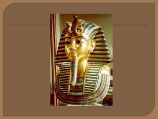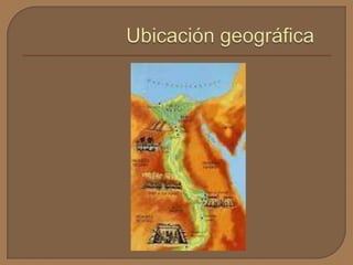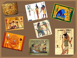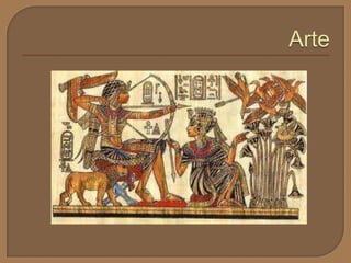 Los egipcios se asentaron a orillas del río Nilo hace unos 5,000 años y desarrollaron una sociedad agrícola y una religión basada en dioses como Osiris. Construyeron casas de adobe y piedra, reservando esta última para templos y tumbas piramidales. Creían en la vida después de la muerte y momificaban a sus muertos, colocando objetos en sus tumbas. El faraón gobernaba tanto el estado como la iglesia y el arte glorificaba al faraón y a los dioses.