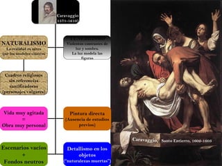 Este documento resume la obra del pintor barroco italiano Caravaggio, destacando su estilo tenebrista y naturalista. Usa fuertes contrastes de luz y sombra para modelar las figuras de forma realista. También se describe brevemente la obra del pintor barroco italiano Aníbal Carracci y su énfasis en la belleza ideal y el paisaje.