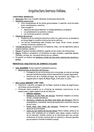 El documento describe el estilo artístico barroco que surgió en Italia en el siglo XVII. Se caracterizó por composiciones dinámicas y asimétricas, un énfasis en la luz y el movimiento, y temas religiosos que buscaban acercar la fe a los fieles. Los principales arquitectos fueron Bernini, quien creó la plaza de San Pedro, y Borromini, conocido por sus plantas ondulantes. El escultor más destacado fue también Bernini, famoso por obras como el éxtasis de