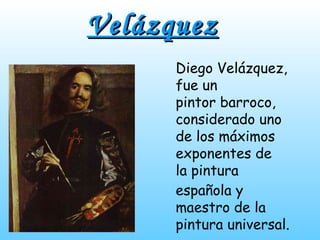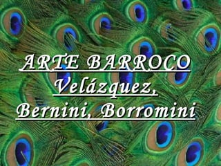 El documento describe tres importantes artistas del arte barroco: el pintor español Diego Velázquez, conocido por obras como Las Meninas y La Venus del espejo; el escultor y arquitecto italiano Gian Lorenzo Bernini, creador de la Fontana di Trevi y El Rapto de Proserpina; y el arquitecto suizo Francesco Borromini, quien trabajó inicialmente con Bernini en Roma antes de una enemistad que duró toda su vida, y creó obras como San Carlos de las Cuatro Fuentes y la Iglesia de Sant