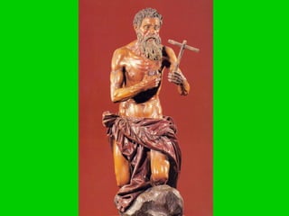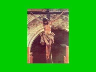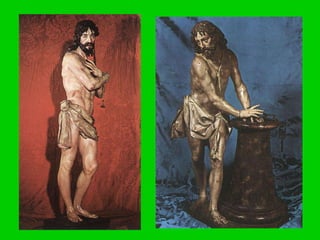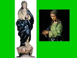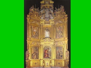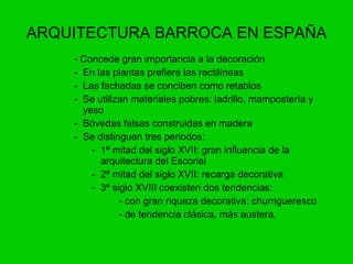 El documento describe la arquitectura y el arte barroco en España. En cuanto a la arquitectura barroca, destaca la importancia de la decoración, las plantas rectilíneas y las fachadas concebidas como retablos. Se distinguen tres periodos principales y dos tendencias en el siglo XVIII. En escultura, destacan maestros como Gregorio Fernández, Juan Martínez Montañés y Pedro Roldán. En pintura, sobresalen artistas como Velázquez, Zurbarán y Murillo.