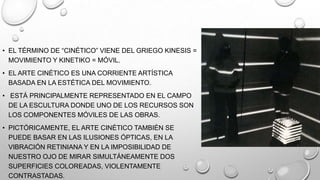 El documento habla sobre el arte cinético, un movimiento artístico basado en la estética del movimiento. Se originó después de la Primera Guerra Mundial pero ganó fuerza en los años 1950 cuando los artistas investigaron el factor cinético de la visión en la creación plástica. Algunos de los principales exponentes fueron Julio Le Parc, Alexander Calder y Jesús Rafael Soto, conocidos por incorporar elementos móviles y crear ilusiones de movimiento.