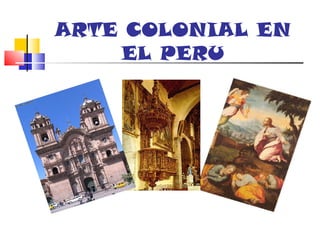El arte colonial en el Perú se desarrolló entre los siglos XVI y XVIII, luego de la conquista española. La pintura colonial estuvo influenciada por corrientes europeas y se enfocó principalmente en temas religiosos para iglesias y conventos. La escultura también tuvo inspiración religiosa y se enfocó en imágenes de vírgenes y santos, así como en la decoración de retablos. La arquitectura empleó estilos como el barroco, churrigueresco y rococó, y se caracterizó por el