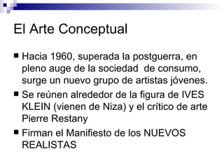 El documento resume el surgimiento del arte conceptual en la década de 1960, liderado por figuras como Yves Klein y Piero Manzoni en Europa, y Christo en Estados Unidos. Se enfocaban en usar objetos cotidianos y el cuerpo humano para alejar el arte de la técnica y acercarlo más a las ideas. Klein desarrolló el uso del color azul internacional Klein y realizó performances donde las personas eran usadas como pinceles. Manzoni creó cuadros blancos y tarros con "merde d'artiste". Christo empezó a envolver