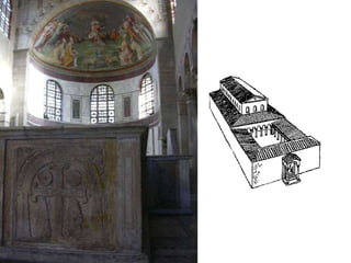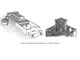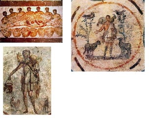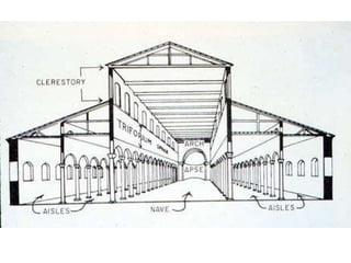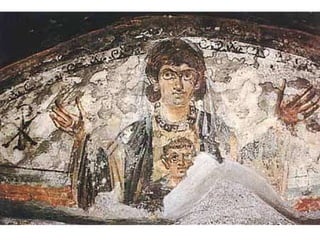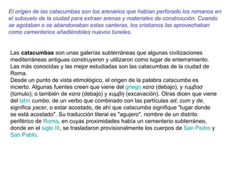 El documento describe las catacumbas cristianas de Roma, incluyendo su origen, estructura, uso como cementerios y lugares de culto, y la evolución de la iconografía cristiana en sus pinturas. También explica el origen de la palabra "catacumba" y resume brevemente la estructura de las primeras basílicas cristianas, con sus diferentes partes como el atrio, nártex y ábside.