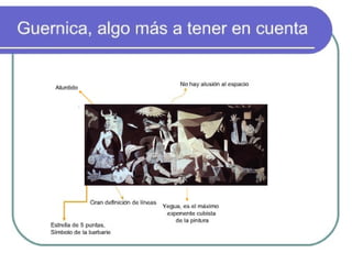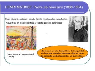 El documento resume las principales características del cubismo, fauvismo y dadaísmo. El cubismo se originó en Francia entre 1907-1914 y se caracteriza por la ausencia de perspectiva y claroscuro tradicionales. El fauvismo surgió en 1905 y se caracteriza por el uso de colores puros y vivos. El dadaísmo surgió en 1915 como protesta contra las convenciones artísticas y pretendía ser el anti-arte, cuestionando la poesía, literatura y arte.