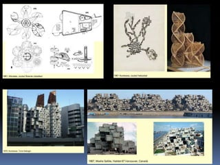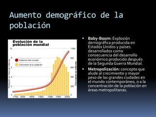 El documento describe los principales cambios culturales y artísticos que ocurrieron después de la Segunda Guerra Mundial, incluyendo el aumento demográfico, la irrupción de la juventud y el movimiento feminista. También analiza el surgimiento de la cultura de masas y los nuevos géneros musicales como el rock and roll, así como los desarrollos en el cine, la pintura y la arquitectura, con movimientos como el Team 10, Archigram y el Metabolismo Japonés.