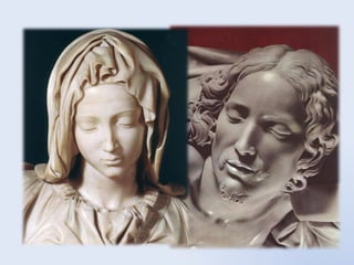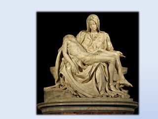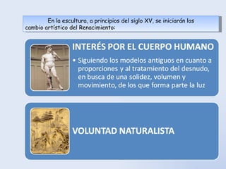 El documento describe los cambios en la escultura durante el Renacimiento en Italia en el siglo XV. Los materiales más utilizados fueron el mármol, el bronce y la terracota. La escultura se usó para decorar edificios y tumbas, y para honrar a ciudadanos destacados. Artistas importantes como Ghiberti, Donatello, Verrocchio y Miguel Ángel crearon obras maestras escultóricas durante este período.