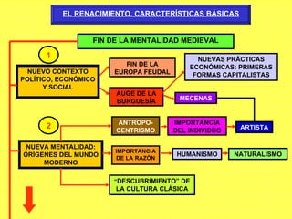 El documento introduce las características básicas del Renacimiento, incluyendo el fin de la mentalidad medieval y el surgimiento de una nueva mentalidad centrada en el individuo y la razón. Señala que el Renacimiento tuvo su origen en Italia durante los siglos XV y XVI, con Florencia y Roma como sus principales centros culturales, y que trajo consigo innovaciones en las artes plásticas y un nuevo ideal de belleza basado en la proporción y la perspectiva.