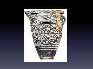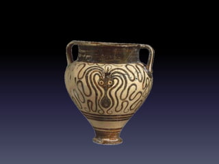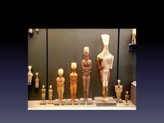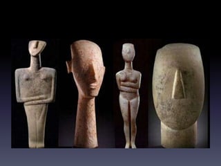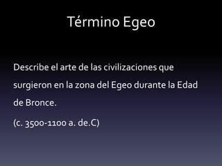Las principales civilizaciones del arte egeo fueron la micénica y la minoica, originadas en las islas de las Cícladas. La cultura minoica de Creta se caracterizó por su refinamiento intelectual y fue considerada la madre de la cultura griega, mientras que el arte micénico tendió hacia lo suntuoso y formalista. Durante la Edad de Bronce, el centro de creatividad artística y política se trasladó a las islas Cícladas.