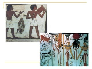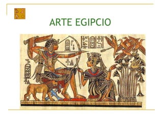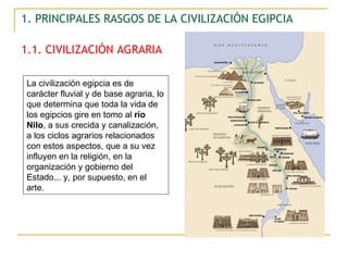La civilización egipcia giraba en torno al río Nilo y su ciclo de crecidas anuales, que fertilizaban la tierra y permitían la agricultura. La religión politeísta egipcia y la creencia en la vida después de la muerte influyeron enormemente en el arte, cuyos temas principales eran los ritos funerarios y el culto a los dioses y a los faraones fallecidos. La arquitectura se centraba en grandes construcciones como las mastabas, pirámides y templos, mientras que la