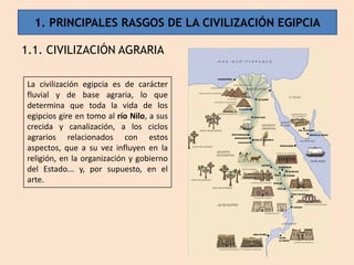 El documento resume las principales características de la civilización egipcia antigua, incluyendo su base agraria, religión politeísta centrada en los dioses y la vida después de la muerte, la monarquía divina del faraón como líder sagrado, y las distintas dinastías y períodos históricos que marcaron su desarrollo político y artístico desde el período predinástico hasta la conquista por los romanos.