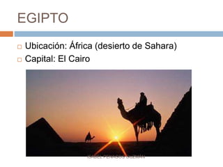 El documento resume la historia del arte egipcio. Explica que la civilización egipcia se desarrolló gracias al río Nilo y que los faraones eran considerados seres divinos. Describe las características de la pintura, escultura y arquitectura egipcias, incluyendo tumbas, pirámides y templos importantes como Abu Simbel y Luxor.