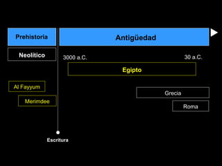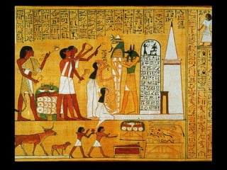 El documento resume las características generales del arte del Antiguo Egipto, incluyendo su religiosidad, politeísmo, temas como la muerte y los dioses. Describe formas arquitectónicas como mastabas, pirámides y templos, así como esculturas, pinturas y la importancia de la Piedra de Rosetta en la comprensión de los jeroglíficos egipcios.