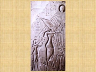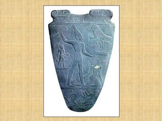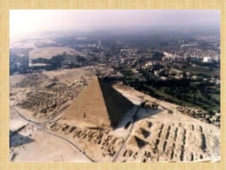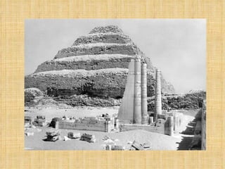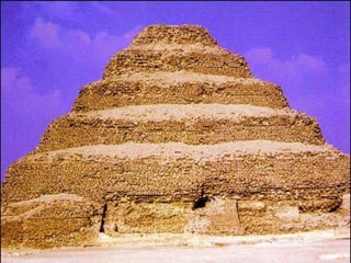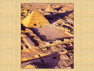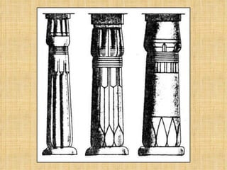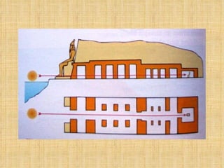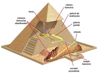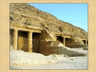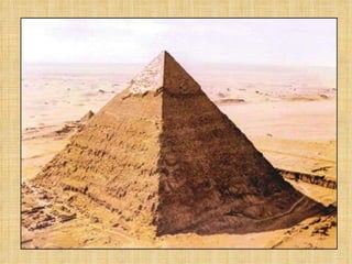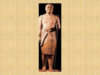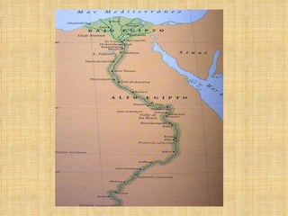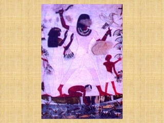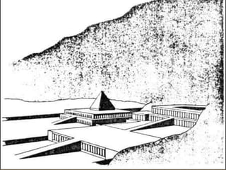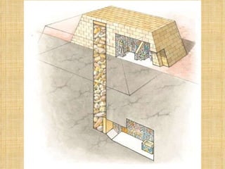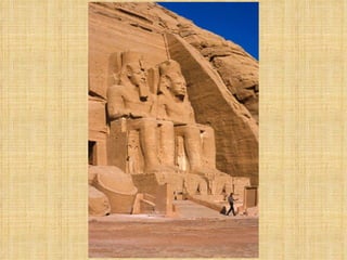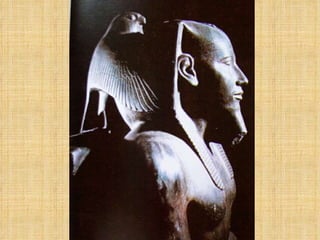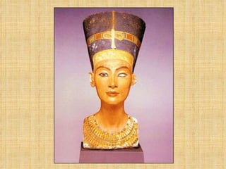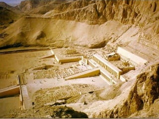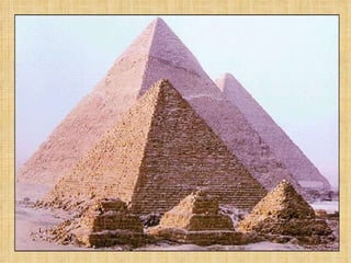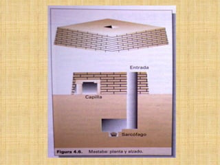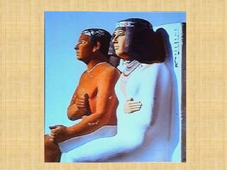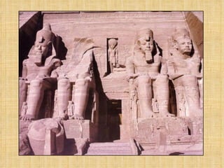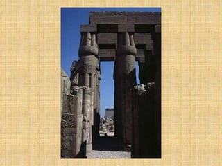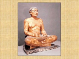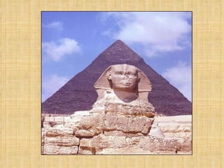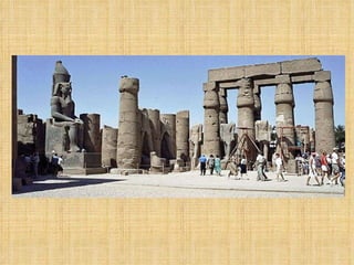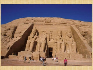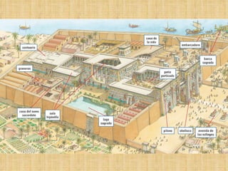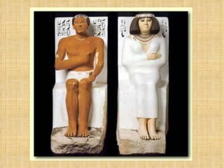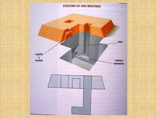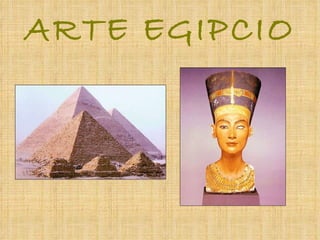 El documento proporciona información sobre el arte egipcio. Brevemente describe que la civilización egipcia se centraba en el valle del río Nilo y estaba dominada por faraones divinizados. El arte egipcio servía para expresar la grandeza de los faraones y manifestar ideales religiosos como la creencia en la vida después de la muerte. Algunas formas artísticas importantes eran la arquitectura de mastabas, pirámides e hipogeos, así como la escultura y pintura.