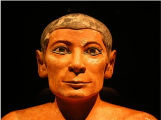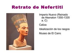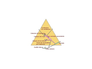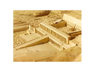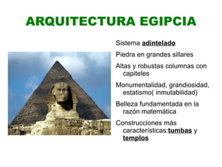 El documento describe la arquitectura y el arte del antiguo Egipto, desde las primeras dinastías hasta el Imperio Nuevo. La arquitectura egipcia se caracterizaba por el uso de grandes sillares de piedra, columnas robustas y templos y pirámides monumentales dedicados principalmente al culto funerario y a los faraones. Las primeras tumbas reales fueron mastabas y pirámides escalonadas, mientras que durante el Imperio Antiguo se construyeron las grandes pirámides de Giza. La escult