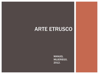 El resumen resume un documento sobre el arte etrusco. Los etruscos dominaron el norte y centro de Italia desde el siglo VIII aC. hasta la llegada de Roma. Su arte era sencillo y utilitario, inspirado en las creencias de ultratumba. La arquitectura etrusca introdujo elementos como el podium y el orden toscano que luego serían adoptados por Roma. La escultura etrusca estuvo influenciada por el arcaísmo griego y mostraba interés por representar la vida después de la muerte. La pintura funeraria
