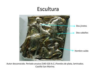 El documento describe diferentes aspectos del arte etrusco como la escultura, pintura y arquitectura. En la escultura se mencionan dos piezas de caballos y un hombre caído hechos de plata datados en el período arcaico. La pintura describe un fresco de 480 a.C. que muestra danzantes celebrando la muerte. La arquitectura presenta un arco de piedra del siglo III a.C. en Perugia con metopas y friso que formaba parte de murallas protectoras.