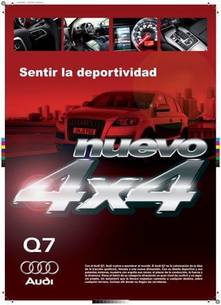 El documento habla sobre el Audi Q7. Se describe como un automóvil con tracción quattro que asombra con su diseño deportivo y potentes motores. Ofrece gran confort y espacio interior. Es capaz de llevar a los pasajeros de forma majestuosa a cualquier destino sobre cualquier terreno, incluso donde no llegan las carreteras.