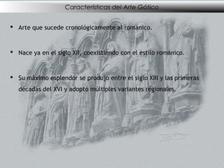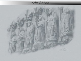 El documento describe las características del arte gótico, incluyendo su arquitectura, escultura y pintura. La arquitectura gótica se caracteriza por su verticalidad y ligereza, utilizando elementos como arbotantes, contrafuertes y vidrieras. La escultura gótica muestra un mayor realismo en rostros y movimiento. La pintura gótica incluye temas religiosos y retratos, con un estilo más detallista influenciado por la pintura flamenca de Van Eyck.