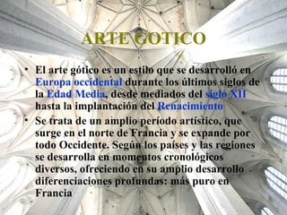 El documento describe el arte gótico en Europa occidental entre los siglos XII y XV. Se caracteriza por su verticalidad y uso de la luz, reflejando la divinidad. Utiliza arcos ojivales y bóvedas de crucería que permiten muros diáfanos cubiertos de vidrieras. Sus principales monumentos incluyen catedrales en Francia, Inglaterra, Italia, España y Alemania.