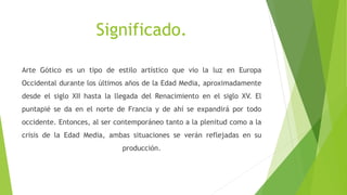 El arte gótico fue un estilo artístico que surgió en Europa Occidental entre los siglos XII y XV, caracterizado principalmente por la construcción de imponentes catedrales con plantas de cruz latina, naves altas y anchas, y el uso de vitrales y miniaturas. Algunos ejemplos notables de arte gótico en México son la Catedral de Guadalajara, la Catedral de Tepic y el Templo Expiatorio del Santísimo Sacramento.