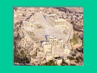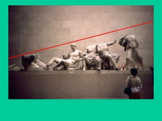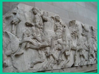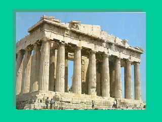 El documento resume la historia del arte griego desde las culturas prehelénicas hasta el periodo helenístico. Describe las características de la arquitectura, escultura y cerámica griegas, incluyendo los órdenes arquitectónicos, los templos, los estilos escultóricos y los tipos de cerámica. También analiza las obras y estilos de importantes artistas griegos como Fidias, Policleto y Praxíteles.