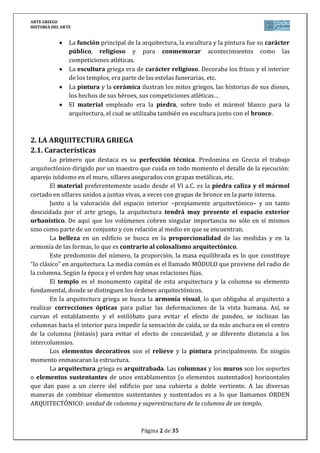 El documento proporciona información sobre el arte griego. Brevemente resume: 1) El arte griego floreció entre los siglos VIII y II a.C., especialmente en el siglo V a.C. durante el periodo clásico; 2) La arquitectura griega se caracterizó por el uso de las columnas y los tres órdenes (dórico, jónico y corintio); 3) Los templos griegos solían tener una cella rodeada de columnas y se decoraban con relieves en los frontones y frisos.