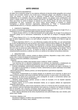 El documento describe la arquitectura griega. La arquitectura griega más representativa era el templo, que generalmente formaba parte de un conjunto sagrado. Los templos griegos seguían los órdenes arquitectónicos dórico, jónico o corintio. El Partenón de Atenas es el ejemplo más famoso de templo griego, construido siguiendo el orden dórico con columnas, entablamento y frontones.