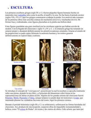 El documento resume la evolución del arte griego en tres períodos (geométrico, arcaico y clásico) y describe sus principales características en pintura, escultura y arquitectura. En pintura, las decoraciones de cerámica pasaron de formas geométricas a incluir figuras humanas estilizadas. En escultura, las primeras obras eran figuras de arcilla pero luego se usó piedra para representar la belleza ideal. En arquitectura, el templo griego evolucionó de una sala rectangular de adobe y madera a monument