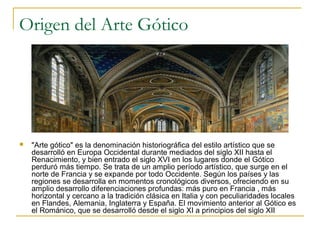 El documento describe el origen y características del arte gótico en Europa. Surge en Francia en el siglo XII y se expande por Occidente hasta el siglo XVI. Se caracteriza por el arco ojival, pilares esbeltos, grandes ventanales con vidrieras, y bóvedas de crucería. La escultura y pintura góticas también se desarrollan en esta época. Algunas obras relevantes incluyen la Abadía de Westminster, la Catedral de Chartres y la Basílica de Saint-Denis. Artistas notables fuer