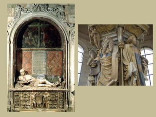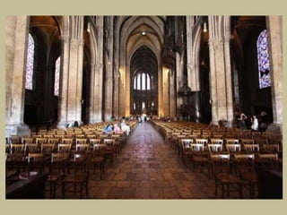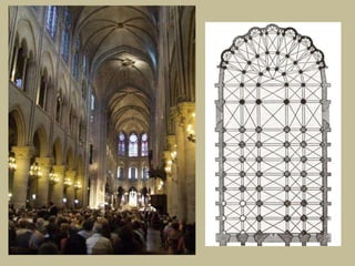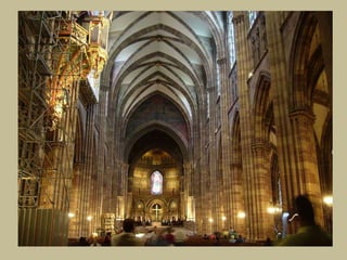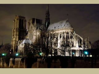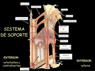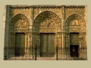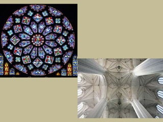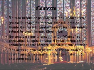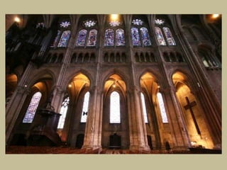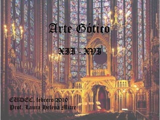 El arte gótico se desarrolló entre los siglos XII y XVI. Se caracterizó por el uso del arco apuntado, las bóvedas de crucería y elementos estructurales como contrafuertes y arbotantes. La escultura gótica se volvió más realista y representó temas religiosos y paganos. Algunos de los ejemplos más importantes de la arquitectura gótica incluyen la Abadía de Saint Denis, Notre Dame de París y las catedrales de Chartres y Burgos.
