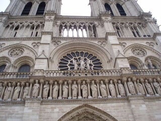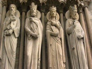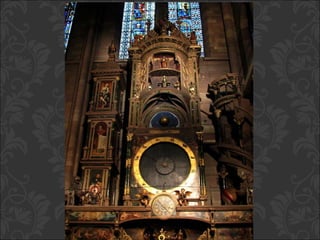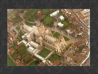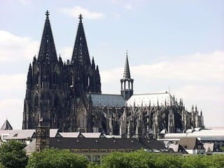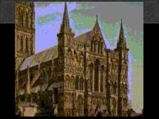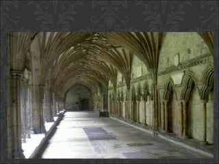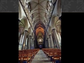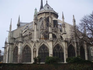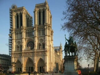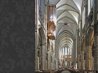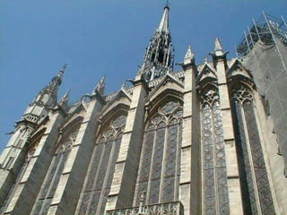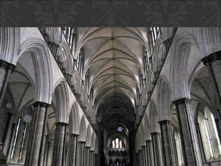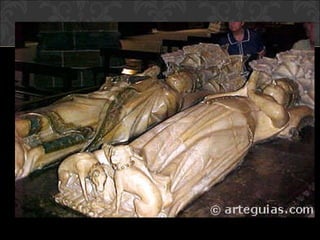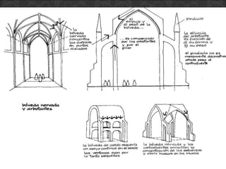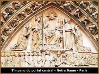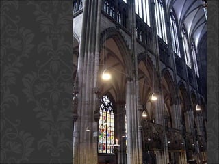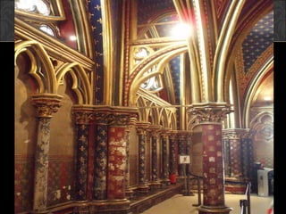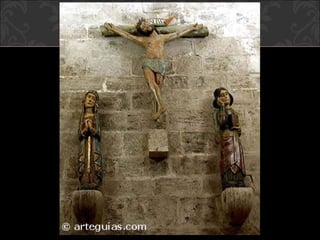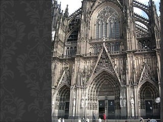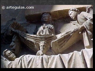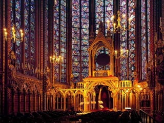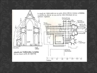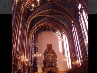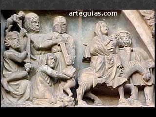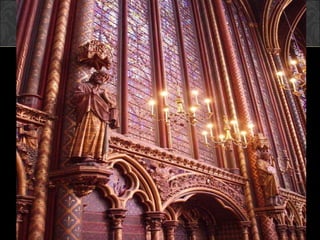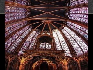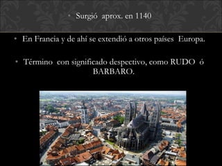 El documento describe el arte gótico, que surgió en Francia en el siglo XII y se extendió por Europa. Se caracteriza por el uso del arco apuntado, bóvedas de crucería, grandes ventanales con vidrieras de colores, y fachadas con rosetones. Incluye escultura, pintura, arquitectura religiosa y manuscritos iluminados.
