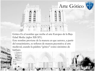 El arte gótico fue el estilo artístico dominante en Europa entre los siglos XII y XV. Se caracterizó por catedrales con grandes ventanales de vidriera que llenaban los espacios interiores de luz, y por el uso de nervaduras para soportar el peso de las bóvedas y tejados. Algunos de los principales ejemplos son las catedrales de Notre Dame en París y Chartres, y la Sainte-Chapelle en París.