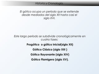 El documento resume la historia y características principales del arte gótico en Europa entre los siglos XII y XVI. Dividió este período en cuatro fases y describió el contexto histórico, filosófico y social. Explicó que la arquitectura gótica se caracterizó por catedrales más altas y luminosas con bóvedas de crucería y contrafuertes. También resumió los desarrollos en pintura, escultura y otros medios artísticos durante la era gótica.
