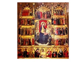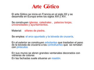 El arte gótico se desarrolló en Europa entre los siglos XIII y XIV, caracterizado por la construcción de catedrales, iglesias y otros edificios públicos con materiales como la piedra y el uso del arco apuntado y la bóveda de crucería. La escultura gótica, tanto en relieve como exenta, se volvió más expresiva que la románica, representando figuras religiosas como Cristo crucificado o la Virgen con el Niño. La pintura gótica también se volvió más realista, desarrollándose sobre tabl