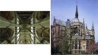 El documento describe las características generales de la arquitectura gótica, incluyendo sus elementos estructurales como arcos apuntados, pilares, bóvedas de crucería y arbotantes, así como detalles sobre plantas, alzados, cubiertas y decoración. También resume la difusión del estilo gótico en países europeos como Francia, Alemania, Italia, destacando catedrales representativas en cada región.