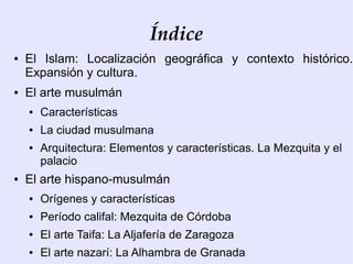 Este documento describe el arte hispano-musulmán. Explica que el Islam surgió en el siglo VII d.C. y se expandió rápidamente, llegando a la Península Ibérica en el siglo VIII. Luego describe las características del arte musulmán, incluida su arquitectura anicónica y su énfasis en la decoración. Finalmente, analiza ejemplos específicos de la arquitectura hispano-musulmana como la Mezquita de Córdoba y la Alhambra de Granada.
