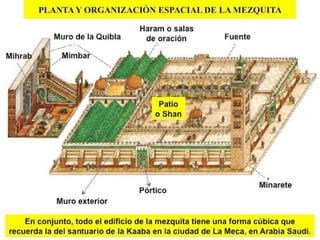 El documento resume la historia y características principales del arte islámico. Explica que surgió tras la predicación de Mahoma en el siglo VII y se expandió rápidamente. Los principios fundamentales del arte islámico son la iconofobia, la geometría y la epigrafía. La arquitectura islámica destaca por su rica decoración geométrica y el uso de azulejos. El arte hispano-musulmán floreció en Al-Ándalus y dejó obras maestras como la Alhamb
