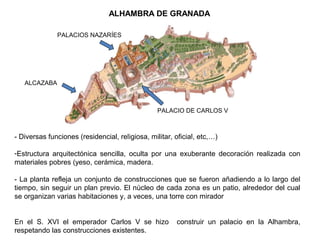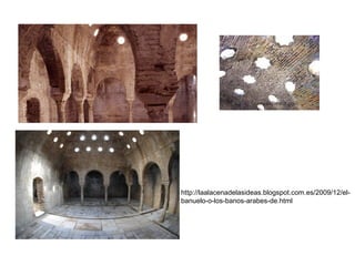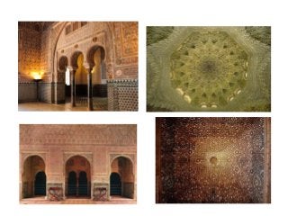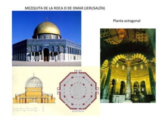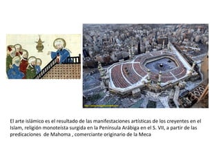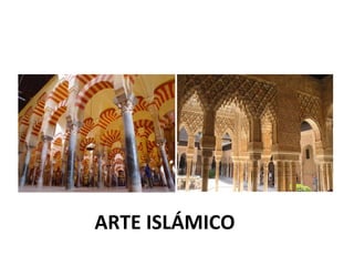 El arte islámico surgió a partir de las enseñanzas de Mahoma en el siglo VII y se expandió rápidamente por el mundo. Se caracteriza por la preponderancia de la arquitectura sobre otras artes, el uso de materiales sencillos y la decoración profusa. La mezquita es el principal edificio, con salas de oración y patio, y alcanzó su máxima expresión en la Mezquita de Córdoba.