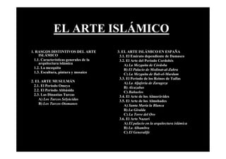 El documento describe el arte islámico en España, incluyendo sus características generales, influencias y principales edificios. Destaca la arquitectura del periodo cordobés como la Mezquita de Córdoba y el Palacio de Medinat al-Zahra, así como el arte nazarí de la Alhambra de Granada con sus palacios como el Mexuar, el Diwan y el Harem.