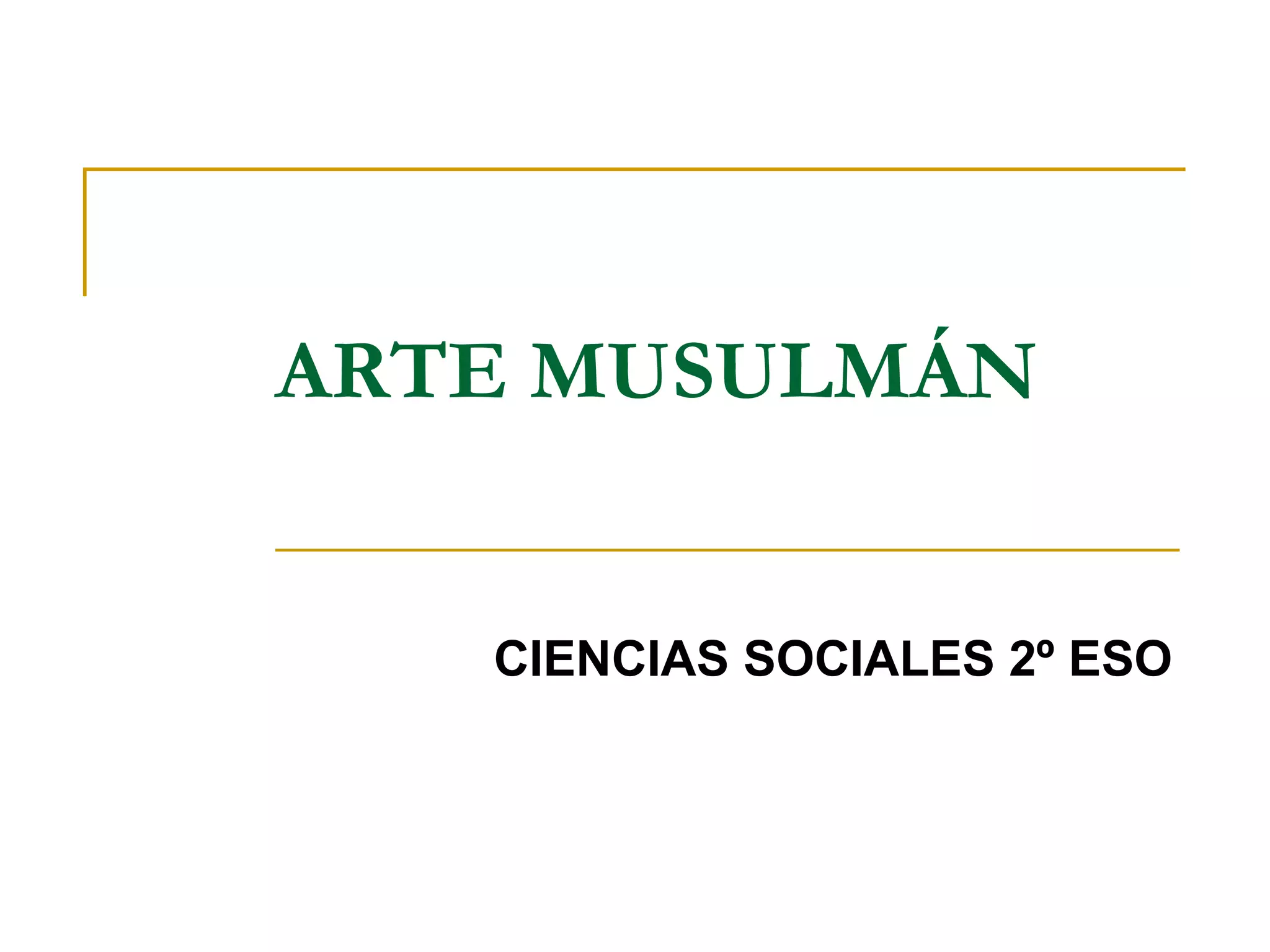 El documento resume las características principales del arte musulmán. La arquitectura es el arte más importante, destacando edificios religiosos como mezquitas y madrasas, civiles como zocos y palacios, y militares como alcazares. La mezquita de Córdoba y la Alhambra son ejemplos notables. La decoración interior es fastuosa a través de epigrafía, motivos geométricos y vegetales, aunque la escultura y pintura están limitadas por la religión.