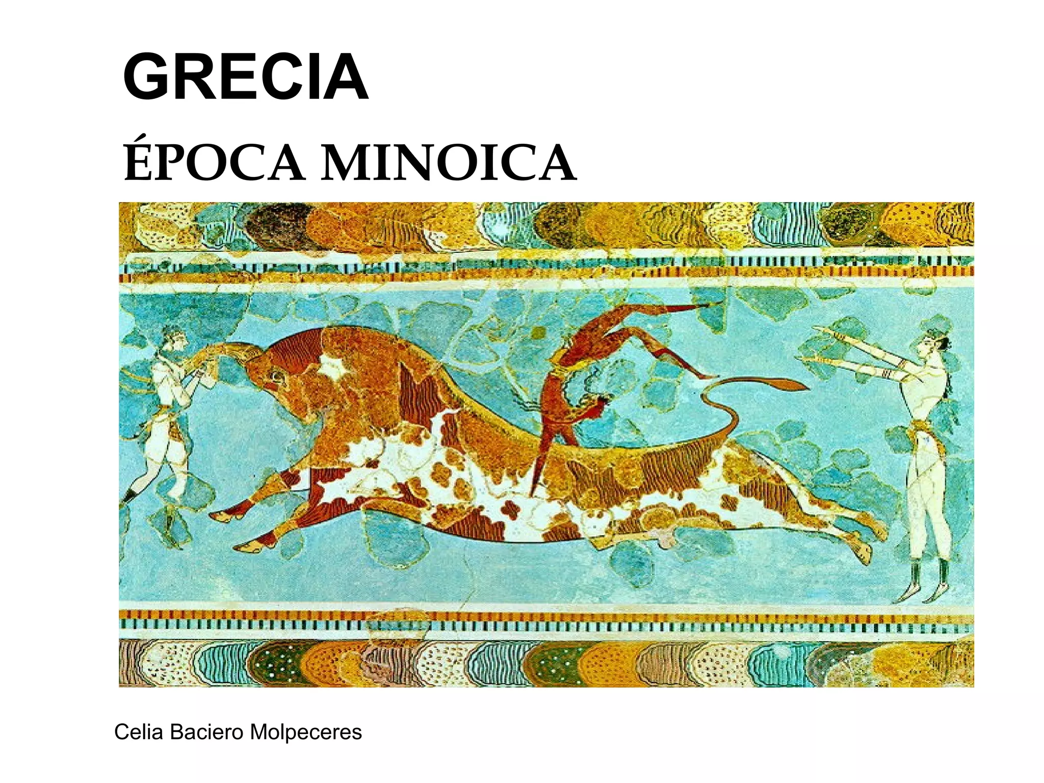 El documento resume la civilización minoica de Creta, que floreció entre el 2000 y el 1450 a.C. Los minoicos crearon una sociedad próspera y pacífica centrada en los palacios de Cnosos y otros, donde desarrollaron un arte naturalista y colorido. Sin embargo, su cultura llegó a su fin debido a la erupción volcánica en la isla de Thera en el 1450 a.C., que provocó un tsunami que asoló Creta.