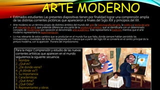 El documento presenta información sobre diferentes corrientes artísticas del arte moderno como el impresionismo, expresionismo, cubismo y surrealismo. Define cada corriente, explica su origen e importancia, y destaca sus características y representantes más importantes. El objetivo es lograr una comprensión amplia de estas nuevas corrientes pictóricas que surgieron a finales del siglo XIX y principios del XX.