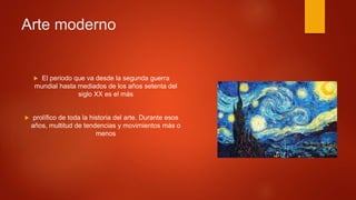 El arte moderno se desarrolló a finales del siglo XIX y principios del siglo XX, siendo el periodo más prolífico de la historia del arte. Multitud de tendencias y movimientos como el impresionismo, posimpresionismo, cubismo, expresionismo, futurismo, fauvismo y surrealismo cuestionaron las convenciones artísticas. Los artistas buscaban romper con el academicismo e incorporar nuevas técnicas inspiradas en la naturaleza y la revolución industrial.
