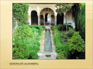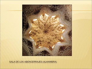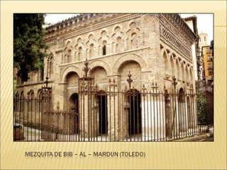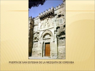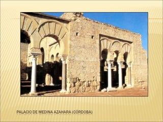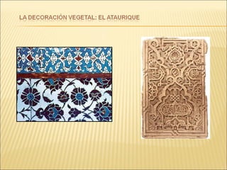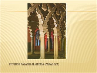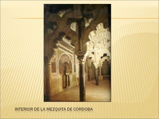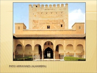 El documento describe el arte y la religión en el Islam. Explica que el arte islámico está íntimamente ligado a la religión y refleja la fe musulmana. Debido a que sólo Dios puede crear, el arte islámico evita las imágenes humanas y en su lugar utiliza formas geométricas, caligrafía y arabescos florales. También describe los principales elementos arquitectónicos de las mezquitas musulmanas como el patio, el muro de la qibla y el minarete.