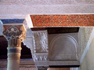El documento describe la Alhambra de Granada, un palacio fortaleza nazarí del siglo XIII-XV. Se compone de varios recintos amurallados y palacios unidos sin un plan previo, destacando el Palacio de Comares y el de los Leones. Su arquitectura y decoración son de gran refinamiento, utilizando la naturaleza, el agua y la caligrafía para crear un ambiente de tranquilidad que acerque al visitante a Dios.