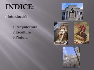 El documento resume el arte neoclásico en España, que se introdujo con la llegada de Felipe V en 1714. La arquitectura fue la primera en reflejar esta renovación, con arquitectos como Ventura Rodríguez y Juan de Villanueva. La escultura tuvo un desarrollo menos visible, aunque Juan Adán la llevó al neoclasicismo. Goya hizo decoraciones palaciegas en un estilo distante y colorido, pero excelentes retratos como el de Carlos III.