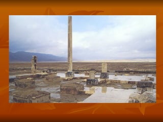 El Imperio Persa se formó en el actual Irán a través de la fusión de los medos y los persas. Fue gobernado por dinastías como los aqueménidas, destacando Ciro el Grande, Darío I y Jerjes I. Desarrollaron una arquitectura monumental en Persépolis y Susa, con palacios, columnas y relieves, así como tumbas rupestres. Su sociedad estaba estratificada con el rey a la cabeza y diferentes grupos como nobles, campesinos y esclavos.