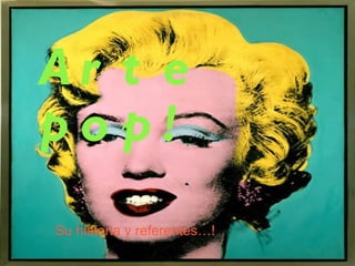 El Arte Pop surgió entre 1956 y 1966 en Inglaterra y Estados Unidos como oposición al expresionismo abstracto, tomando imágenes de la cultura popular de los medios de comunicación. Se caracteriza por ser figurativo y realista, con colores brillantes y temas basados en la vida urbana. Artistas clave incluyen a Andy Warhol, Richard Hamilton y Roy Lichtenstein.